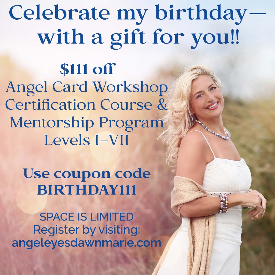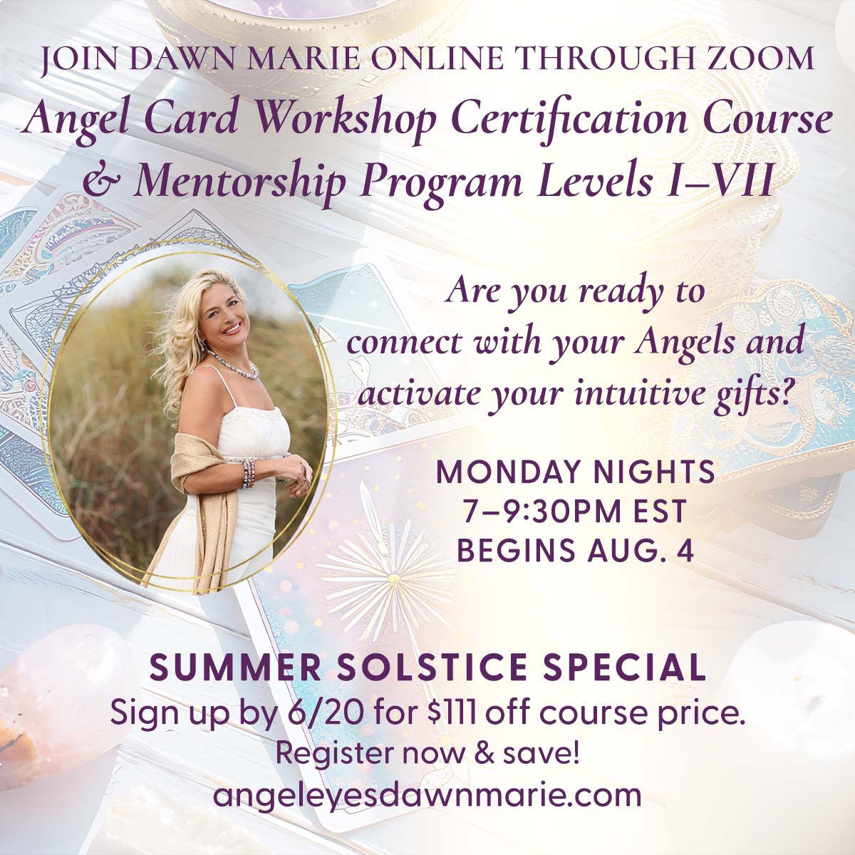 Join this transformative Angel Card Workshop, led by Dawn Marie, a highly sought-after spiritual teacher with over 15 years of experience. This seven-level certification course and mentorship program will teach you how to connect with your Angels and Spirit through the powerful tool of Angel Cards.